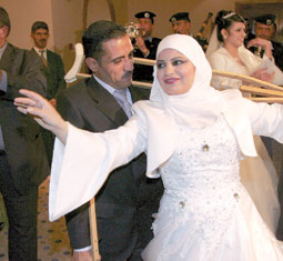 عروس أردنية تشارك زوجها الرقص خلال حفل زواج جماعي أقيم للأزواج المعاقين ورعته إحدى مؤسسات المجتمع الخاصة في عمّان. |