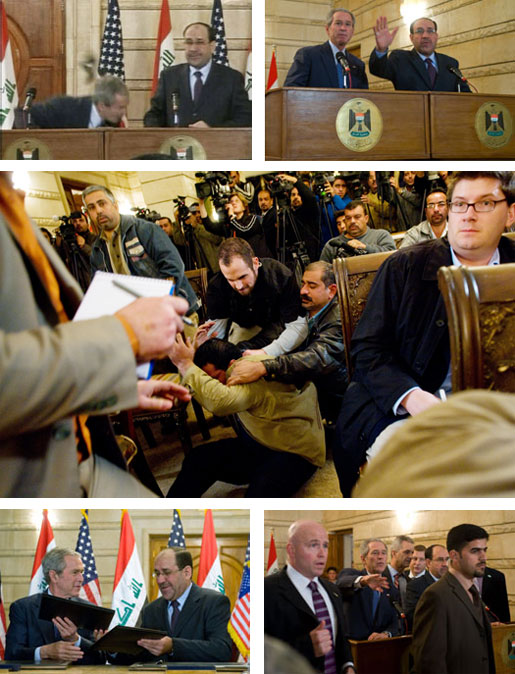 وخلال موتمر صحفي جمعه برئيس الوزراء العراقي نوري المالكي ببغداد قام صحافي عراقي برشق حذائه باتجاه الرئيس بوش دون أن يصيبه، ثم شتم الرئيس الأمريكي، حيث قام مراسل قناة (البغدادية) الصحافي منتظر الزيدي الذي كان واقفا بين المراسلين برشق حذائه باتجاههما قائلا (هذه قبلة الوداع يا كلب).