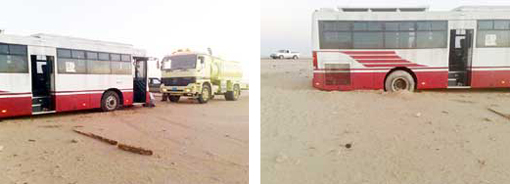 وكان قائد الحافلة قد حاول التوقف بجوار الطريق ولكن إطارات الحافلة غاصت في الرمال، وبعد أن باءت محاولات إخراج الحافلة بالفشل قام بإبلاغ فرق الدفاع المدني بظلم التي باشرت بدورها الموقع وتم إخراج الحافلة.