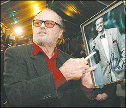 الممثل السينمائي جاك نيكلسون يؤشر للجمهور على صورة قديمة له وعليها توقيعه خلال وصوله لمتحف كالفيورنيا للمشاهير....>>>... | |