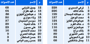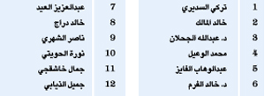 حيث حصل الأستاذ تركي السديري على 228 صوتاً والأستاذ خالد المالك 226 صوتاً ود. عبدالله الحجلان بـ199 صوتاً، فيما حصل عبدالوهاب الفايز على 124 صوتاً ومحمد الوعيل على 137 صوتاً ود. خالد الفرم على 118 صوتاً.