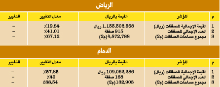 سجّل المؤشر العقاري الأسبوعي الصادر عن الإدارة العامة للحاسب الآلي بوزارة العدل، لكتابتي العدل الأولى بالرياض والدمام للفترة من يوم السبت 29-12 إلى الأربعاء 3-1-1430هـ انخفاضاً في قيمة الصفقات في كتابة عدل الرياض نسبته 19.84%، حيث بلغ إجمالي قيمة الصفقات خلال هذا الأسبوع 1.155.502.568 ريالاً، كما انخفض المؤشر في كتابة عدل الدمام بنسبة 57.85%، حيث بلغ إجمالي قيمة الصفقات نحو 109.062.286 ريالاً.