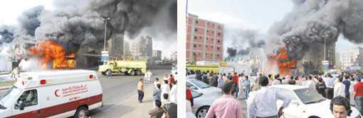 فرق الدفاع المدني وصلت للمنطقة في زمن قياسي رغم الازدحام الشديد للسيارات في تلك المنطقة ذلك الوقت حيث تم محاصرة النيران أولا من جهة محل الغاز في الوقت الذي كان يتم تفريغ المكان وبعد ذلك تم حصار النيران المشتعلة بالمركز التجاري التي تواصل لهيبها مشتعلا لارتفاع عال فيما تم اخلاء المباني القريبة من السكان.