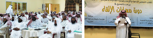 أقام المكتب التعاوني للدعوة والإرشاد وتوعية الجاليات في العرضية الجنوبية دورة في مهارات الإلقاء بالمركز الحضاري للمجمع القروي بثريبان أمس وذلك بحضور أكثر من مائة متدرب من معلمين وطلاب ومشرفين وموظفين وقد بدأ اللقاء بكلمة ترحيبية لمدير المكتب الأستاذ عبدالله بن أحمد القرني رحب فيها بالجميع شكرهم على حضورهم في الموعد.. عقب ذلك بدأ برنامج الدورة قدمه مدير مركز الإلقاء والتدريب بالرياض عبدالله بن محمد البابطين. تلا ذلك تنفيذ ورشة من قبل المتدربين، هذا وقد استمرت الدورة نحو ثلاث ساعات.وخلصت الدورة إلى كيفية كسر حاجز الخوف والوجل والتردد عن ملقي كلمة أو خطبة أو حديث في جمع غفير بطلاقة وثقة في النفس بعد تدريب ومران دون النظر إلى نقد الناقدين ومتتبعي الهفوات.
