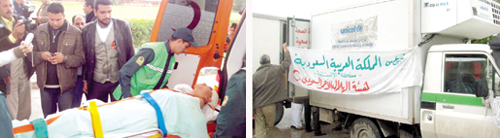 تسلم الهلال الأحمر الفلسطيني عبر منفذ رفح أمس الدفعة الثانية من المساعدات السعودية التي أمر بها خادم الحرمين الشريفين الملك عبدالله بن عبدالعزيز آل سعود لتأمين المستلزمات الطبية والأدوية للأشقاء الفلسطينيين بحضور مندوب سفارة فلسطين والمنسق لدخول المواد الطبية والإغاثية إلى مصر محمد فايز عرفات.