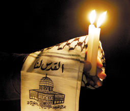 أحد المحتجين في الأردن يحمل (حطة فلسطينية) عليها شعار (القدس لنا) ورسمة المسجد الأقصى أثناء مسيرة ضد الهجوم الإسرائيلي على قطاع غزة. |