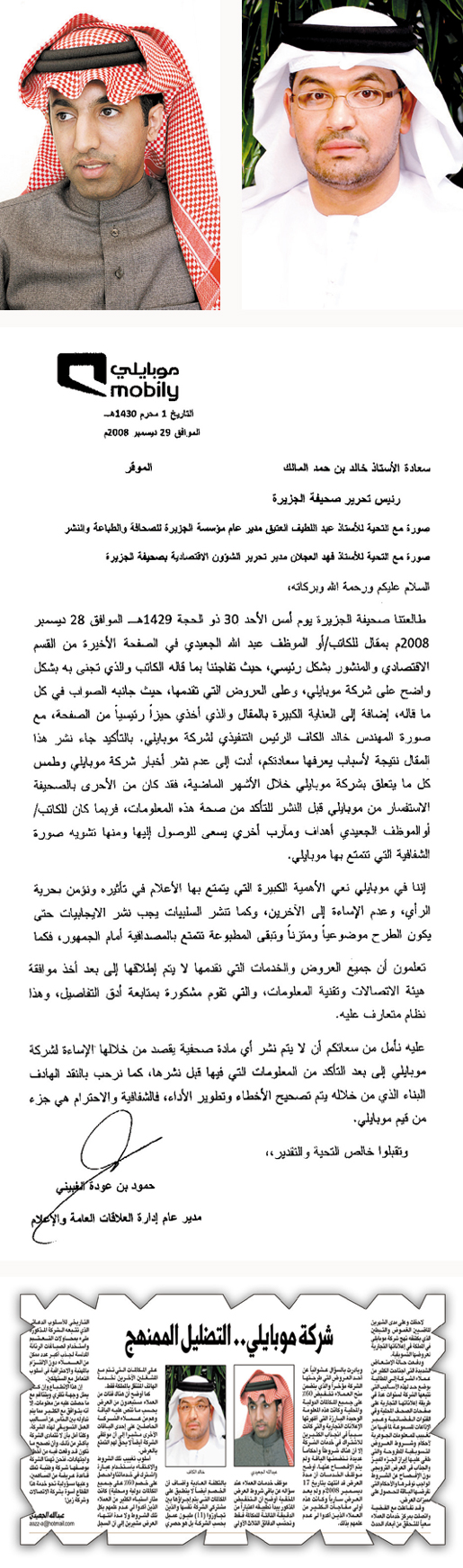 بشركة موبايلي، والزميل عبدالله الجعيدي مع استعداد الجزيرة لنشر أي توضيح جديد