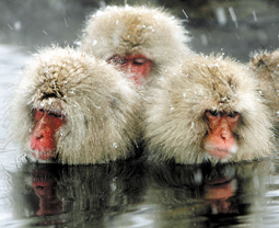 مجموعة من قردة البابون تسترخي في بركة مياه ساخنة في منطقة ملبدة بالثلوج...>>>...