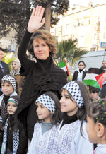 سيدة سورية الأولى أسماء الأسد ملوحة لعدسات الكاميرا وحولها يبدو أطفال فلسطينيون خلال مظاهرة مناهضة لإسرائيل في مخيم اليرموك قرب العاصمة دمشق. |