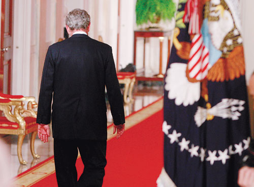 يغادر اليوم (جورج بوش تاركا خلفه دعوات الملايين) عليه (بعد أن شهد العالم خلال ثمانية أعوام هي فترة تسيده المكتب البيضاوي حروباً وصراعات وانقسامات خلفت مئات الألوف من القتلى والملايين من الجرحى). |
