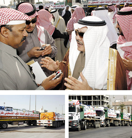 جاء ذلك خلال التدشين بحضور معالي مستشار وزير الداخلية رئيس حملة خادم الحرمين الشريفين لإغاثة الشعب الفلسطيني بغزة الدكتور ساعد العرابي الحارثي. وقال مبارك البكر مدير الحملة: يحتوي الجسر البري (المرحلة الأولى) على المواد الغذائية والطبية وسيارات الإسعاف والملابس والحليب المجفف طويل الأجل، مشيراً إلى أن هذا الجسر مستمر بمشيئة المولى عز وجل بناء على الخطة التي اعتمدها سمو المشرف العام للإغاثة لمدة شهر يستفيد منها حوالي أكثر من 850 ألف داخل فلسطين. من جهته قال فضيلة الشيخ وليد الرشودي: هذا الموقف يعد موقف تسارع وتسابق للخير، وإيصال أكبر ما يمكن إلى أولئك الذين استطاعوا أن يصبروا في أقسى عملية تحصل في تاريخ البشرية اليوم من إبادة بشرية بأكبر آلة حرب في العالم. إلى ذلك عد الدكتور ساعد العرابي الحارثي أن المملكة تقف مع الحق دائماً، مشيراً إلى أنه عندما بدأت الكارثة في الحرب الشرسة التي لا تجد للرحمة معنى واستبيح الحجر والبشر، وكعادتها المملكة وقفت لنصرة المظلوم صاحب الحق، وأعلن خادم الحرمين الشريفين الملك عبد الله بن عبد العزيز آل سعود أمره لصاحب السمو الملكي الأمير نايف بن عبد العزيز وزير الداخلية بإقامة هذه الحملة لإغاثة الشعب الفلسطيني بغزة، ومن ذلك التاريخ هب المواطنون والمقيمون في هذه الأرض الطيبة المباركة لمساعدة إخوتهم، حيث بدأنا بتلقي المساعدات قبل انطلاق الحملة، مؤكداً معاليه استمرار الأعمال الإغاثية السعودية البرية بجانب الجسر الجوي السعودي الذي بدأ تسييره من بدء العدوان الإسرائيلي على القطاع. مشيراً د. الحارثي إلى أن المرحلة الأولى من الجسر البري تشمل خمس عشرة شاحنة تحمل 30 سيارة إسعاف مجهزة وثلاث عشرة شاحنة محملة بالمواد الغذائية، وسبع شاحنات حليب، وأربعاً أخرى إمدادات طبية، وثلاث شاحنات أرز، وشاحنتي دقيق بر، ومثلهما محملتين بالتمور، وشاحنة محملة بعبوات من زيت الطعام، وشاحنة بالسكر، وشاحنتين بالملابس الجديدة والأغطية والبطانيات.