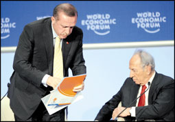 شهدت إحدى الجلسات الحوارية لمنتدى دافوس مشادة كلامية بين رئيس الوزراء التركي رجب طيب أردوغان ورئيس الكيان الإسرائيلي شيمون بيريز، ففي الندوة التي ضمت أردوغان وبيريز وموسى أمين عام الجامعة العربية، وبان كي مون أمين عام الأمم المتحدة، تحدث كي مون وبعده عمرو موسى كل منهما أقل من 10 دقائق، تكلم أردوغان 12 دقيقة وتحدث عن تجاوزات إسرائيل في عدوانها على أهل غزة، وقد أغضبت هذه الأقوال رئيس الكيان الإسرائيلي الذي خرج عن الأصول ورفع صوته موجهاً كلامه لأردوغان، بماذا يكون موقفه حينما تقصف أسطنبول بالصواريخ، وبعد 25 دقيقة من الكلام والصراخ أنهى كلامه متهماً كل من يعترض على أفعال إسرائيل بأنه معاد للسامية، وقد قوبلت كلمة بيريز بالتصفيق من بعض الحضور، طلب أردوغان الكلام وعندما لم يستجب له الصحفي الذي يدير اللقاء، رد بهدوء على بيريز قائلاً له إنه أكبر سناً منه لذلك لن يجاريه في رفع صوته، إلا أنه يسوءه أن يجد هنا في القاعة من يصفق لقتل أطفال غزة الذين قتلتهم الدبابات الإسرائيلية عند سواحل البحر وأن أولمرت وبعض الوزراء الإسرائيليين يشعرون بالذنب نتيجة ذلك.. أما هنا فيصفق لقتل الأطفال، وعندما لم يسمح له بالاستمرار في الكلام غادر قاعة المنتدى وسط تصفيق من الحضور وشكر من عمرو موسى.