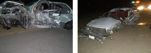 لقي شخصان مصرعهما وأصيب 6 آخرون بإصابات متفرقة نتيجة حادث تصادم عنيف وقع بين سيارتين كامري وكرسيدا مساء أمس نحو 2 كيلومتر على الطريق المتفرع لمركز أحد بني زيد - سبت الجارة شرق القنفدة. وقد نتج عن الحادث وفاة شخصين، وكان يستقل السيارة الكرسيدا كل من سامي محمد الشهري، وحامد عبدالله الشهري . والسيارة الكامري كل من علي شبان الشهري، سالم علي الشهر، علي محمد الشهري، صالح عبدالله الشهري، سالم مصلح الشهري، وعلي محمد الشهري. باشر الحادث الهلال الأحمر السعودي بالقنفذة والدفاع المدني وفرقة من المرور، وتم نقل المتوفين والمصابين إلى مستشفى القنفذة العام.