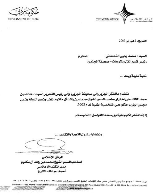 أعربت حكومة دبي عن شكرها إلى صحيفة «الجزيرة» وإلى سعادة رئيس التحرير الأستاذ خالد بن حمد المالك في خطاب وجهه المرافق الإعلامي ومدير المكتب الإعلامي لصاحب السمو الشيخ محمد بن راشد آل مكتوم نائب رئيس الدولة رئيس مجلس الوزراء حاكم دبي السيد أحمد عبدالله الشيخ وذلك بمناسبة اختيار صحيفة «الجزيرة» للشيخ محمد بن راشد آل مكتوم كأفضل شخصية فنية لعام 2008م مقدرين جهود «الجزيرة» والتواصل الدائم بين حكومة دبي و«الجزيرة».