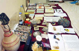 وعثرت الفرقة على مجموعة كبيرة من كتب السحر والطلاسم والشركيات والأعمال السحرية مخبأة في أطراف الغرفة وعدد (22) كتاباً لتعلُّم السحر وكميات من الأوراق بها طلاسم وكتابات سحر وعدد كبير من خواتم السحر ومجموعة من الأبخرة ومواد العطارة والخلطات لتحضير الشياطين وملابس وسلاسل نسائية بداخلها طلاسم سحرية لأشخاص ترددوا عليه لطلب العلاج وأوراق بها طلاسم مكتوبة بخط اليد وسكين مكتوب عليه طلاسم واسم شيطان.