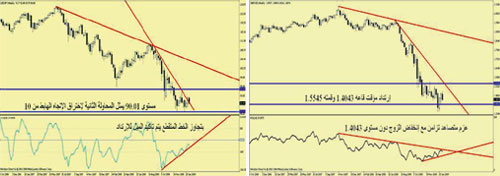 معدل البطالة كان من البيانات الأكبر تأثيراً على اقتصاد العملتين حيث وصل في اليابان إلى 4.4% لشهر ديسمبر معبراً عن 2.7 مليون عاطل عن العمل في اليابان، أما في أمريكا وفقاً لقراءة شهر يناير الأخيرة فبلغ 7.6% وهو الأعلى منذ 26 عاماً مقارنةً بالنتيجة السابقة التي بلغت 7.2% حيث صرح الرئيس الأمريكي بأن عدد العاطلين أصبح قريباً جداً من 5 ملايين عاطل. ومع ذلك نجد أن الزوج، محافظاً على القاعين المتتاليين اللذين تم تسجيلهما مطلع هذا العام عند مستوى 87.03 حاول الأسبوع الماضي اختراق خط الاتجاه الهابط الفرعي عند 90.30 مما يرجح إعادة المحاولة الأسبوع القادم مستهدفاً منطقة 95.00 خصوصاً أن هذا الميل مدعوم أيضاً بانحراف إيجابي وعزم جيد كاف للوصول إلى حاجز 92.65 على الأقل.