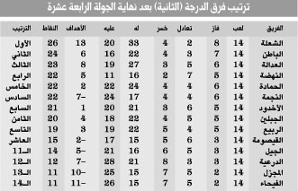 وعلى ضوء نتائج الجولة الرابعة عشر اعتلى فريق الشعلة صدارة الترتيب لأول مرة فيما حل الباطن وصيفاً وحافظ العدالة على المركز الثالث وتقدم الحمادة إلى المركز الخامس وبقي فريق النهضة في المركز الرابع وجاء فريق النجمة في المركز السادس وتراجع الأخدود إلى السابع والربيع إلى التاسع وتقدم الجبلين إلى الثامن في حين بقي أصحاب المراكز الخمسة الأخيرة في مراكزهم وستكون مباريات اليوم على النحو التالي: