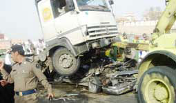 في حادث مأساوي احتجز شابان بين ركام حديد سيارتهما تحت شاحنة تريلا، وكانت السيارة من نوع فورد وبها شخصان قد دخلت أسفل تريلا كبيرة أثناء سيرها باتجاه الطائف قبل كوبري الصيانة، وبقيت محتجزة أسفلها فيما صدرت صيحات المصابين مطالبين بإسعافهم وإخراجهم من بين ركام الحديد، إلى حين وصول رجال الدفاع المدني والجهات المعنية الذين باشروا الحادث بصعوبة بسبب المتجمهرين والفضوليين الذين أوقفوا سيارتهم في الطريق وعلى جوانبه مما أدى لإعاقة وصول فرق الإنقاذ في الوقت المطلوب، حيث وقفت سيارتهم على مسافة بعيدة وبدأوا بمباشرة الحالة عن بعد باذلين جهوداً كبيرة حتى تم إخراج الشابين المحتجزين، أحدهما في حالة خطرة والآخر إصاباته أقل من المتوسط، تم نقلهما على الفور للمستشفى عن طريق فرق هيئة الهلال الأحمر إلا أن احدهما توفي بالمستشفى.