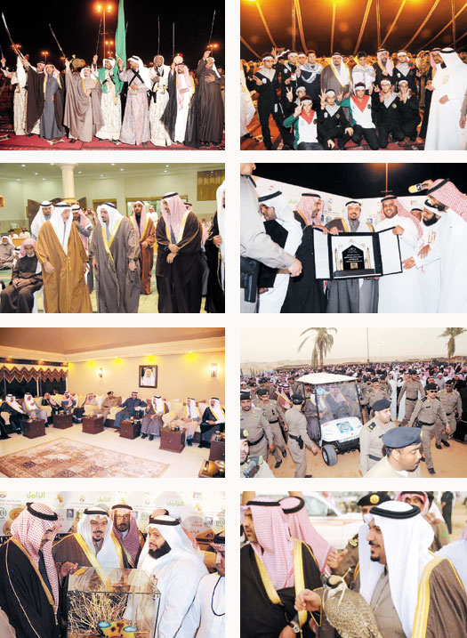 وفور وصول سموه كشف البرقع عن أحد الصقور المدربة والذي انطلق لصيد الحبارى إيذاناً بانطلاق مسابقة الصيد والتي تنظمها لجنة البرامج والفعاليات بالمهرجان والتي تستمر لمدة ثلاثة أيام بمشاركة عدد كبير من الصقارة وهواة الصيد هذه الرياضة العربية الأصيلة. ثم اطلع سموه على ركن العرض لهواة الصقور ومن ثم اطلع على ركن عرض هواة الصيد بالسلق.بعد هذا توجه سموه الكريم ومرافقوه إلى مقر الفعاليات الرياضية حيث اطلع على جانب من العروض والمسابقات الرياضية ثم انطلق موكب سموه ترافقه عدد من الجياد العربية الأصيلة التي يمتطيها عدد من أمهر الفرسان صوب مقر الفعاليات الرئيسية حيث بدأت جولة سموه في مقر سوق الغضا والتراث حيث انطلقت الألعاب النارية ترحيباً بمقدم سموه الكريم. وأثناء جولة سموه في السوق الشعبي أطلع على المقهى التراثي ورأى محلات الأسر المنتجة من الرجال والنساء وشاهد جانباً من الألعاب الشعبية القديمة والتي قدمها مجموعة من الأطفال وشاهد سموه ومرافقوه عروض الحرفيين حيث أبدى سموه سعادته البالغة بما تضمنه السوق من فعاليات مميزة.