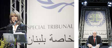 وقال كاتب المحكمة روبن فينست (أرحب بكم في مراسم الافتتاح) كاشفاً عن شعار المحكمة المؤلف من إكليل الغار الأزرق الخاص بالأمم المتحدة يتوسطه ميزان العدالة والأرزة رمز لبنان.