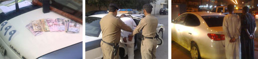 كما تلقت غرفة عمليات دوريات الأمن بمنطقة الرياض بلاغا من أحد الوافدين يفيد بأنه أثناء دخوله أحد البنوك بحي السليمانية لإيداع مبلغ قدره عشرون ألف ريال قام شخص من الجنسية الإفريقية باستغلال الزحمة أمام باب البنك وسرق المبلغ الذي بحوزته وهرب بسيارة أجرة ليموزين. غرفة العمليات قامت على الفور بتعميم أوصاف الجاني وسيارة الأجرة ورقم لوحتها للفرق الميدانية التي باشرت بتقفيل مخارج حي السليمانية، وضبط السيارة وبداخلها الجاني الذي سلم لمركز شرطة السليمانية لاستكمال التحقيق معه بعد أن تعرّف عليه المُبلّغ. كما تلقت غرفة عمليات دوريات الأمن بمنطقة الرياض بلاغا من سائق سيارة أجرة ليموزين يفيد بأن شخصين قاما باستيقافه بأحد الأحياء شرق مدينة الرياض لإيصالهم إلى مشوار حيث قام أحدهم بخطف جهاز جوال السائق، وعندما نزل للحاق به قام زميله بخطف السيارة وهرب لجهة غير معلومة وقاموا بإزالة الملصقات والمصباح من السيارة وتركيب لوحات تابعة لسيارة أخرى مطلوبة ومعمم عنها من مركز شرطة الملز، وقام الجناة بتضليل السيارة والتوجه لحي أشبيليا وسرقة جوال أحد المواطنين أثناء سيره، وفي نفس الحي قاموا بسرقة مواطن آخر، ثم توجه الجناة إلى حي النهضة وقاموا بسرقة مقيم والاعتداء على مواطن وسرقته، ثم غادروا الحي متجهين نحو حي النسيم، حيث تمكنت إحدى فرق دوريات الأمن من الاشتباه بسيارة تنطبق عليها أوصاف المبلّغ بدون مصباح وملصقات وبداخلها الشخصان، وعند الاستعلام عن رقم اللوحة تبين من الحاسوب بغرفة العمليات أن اللوحة تابعة لسيارة أخرى مسروقة ومعمم عنها من قبل مركز شرطة الملز، وعلى الفور تمت متابعة الجناة حتى دخلوا مرة أخرى حي النهضة ليتم تطويق الحي وإيقافهم بالقوة والقبض عليهم، وعثر بحوزتهم على مبالغ مالية وأجهزة جوالات، وسلم الجناة وما ضبط بحوزتهم لمركز شرطة الروضة لاستكمال التحقيق معهم، كما تمكنت فرق دوريات الأمن بمنطقة الرياض من القبض على شخصين بحي الخزان يستقلان سيارة نوع كابرس ذهبية اللون، وقاما بنشل حقيبة سيدة وبداخلها مبالغ مالية وإقامات وهربا من الموقع، فتم توجيه الفرق الميدانية بتتبع الجناة والقبض عليهم، حيث تمكنت إحدى الفرق من ضبطهما قرب الموقع، واتضح أن السيارة معمم عليها من مركز شرطة الشفاء في قضية نشل، وأن الشخصين معمم عليهما من قبل مركز السويدي والديرة والمرور، فتم حجز السيارة وسُلم الشخصان إلى مركز شرطة المربع بالمضبوطات.