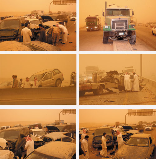 تسببت العاصفة الرملية التي اجتاحت مدينة الرياض يوم أمس في وقوع حادث جماعي لأكثر من (60) سيارة على طريق القصيم بعد مخرج قوات الأمن الخاصة أمام جامعة اليمامة ونتج على الحادث خمس إصابات متوسطة. وقد باشرت فرق مرور الرياض والهلال الأحمر وقوات الأمن الخاص الحادث فور وقوعه عند الساعة (11.30) صباحاً حتى الساعة 2.30 ظهراً.