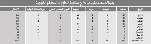 الجدير بالذكر أن الفريق الهلالي يقف في قمة ترتيب الفرق السعودية بـ48 لقباً وبفارق كبير عن وصيفه الاتحاد الذي يملك 30 لقباً، وفيما يلي منجزات الأندية السعودية محلية وخليجية وعربية وآسيوية وإجمالي الألقاب التي توجت بها الأندية السعودية: