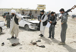 وذكرت وزارة الداخلية الأفغانية أن مهاجماً انتحارياً قتل 11 شخصاً من بينهم تسعة من ضباط الشرطة في جنوب أفغانستان أمس الاثنين. وقال مسؤول محلي في الشرطة: إن المهاجم كان يسير على قدميه وفجّر عبوات ناسفة مثبتة حول جسده وسط مجموعة من الضباط خارج مقر الشرطة الرئيسي في لشكركاه عاصمة إقليم هلمند.