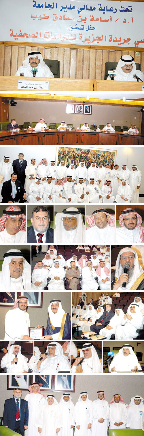 برعاية معالي مدير جامعة الملك عبدالعزيز الأستاذ الدكتور أسامة بن صادق طيب، وبحضور رئيس التحرير الأستاذ خالد بن حمد المالك، ومشاركة زملاء المهنة في الإعلام ووكلاء الجامعة وعمداء الكليات وأساتذة الجامعة والطلاب والطالبات وعدد من المثقفين، تم في قاعة الاحتفالات ومركز المؤتمرات بالجامعة، صباح يوم السبت الماضي، تدشين كرسي جريدة (الجزيرة) للدراسات الصحفية في احتفال أقامته الجامعة بهذه المناسبة.