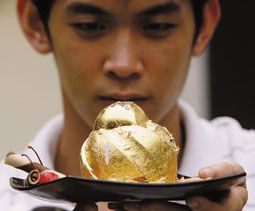 أحد الطهاة يقدم لرجل أعمال فلبيني كعكة من الشوكولاته مغطاة بأوراق الذهب عيار 24 قيراطاً، ومرصعة بـ15 الماسة إفريقية، بلغت تكلفتها 2558 دولاراً. |