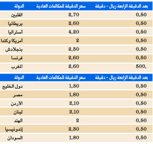 أعلنت شركة الاتصالات السعودية تخفيض سعر الدقيقة إلى 50 هللة على المكالمات لجميع دول العالم بعد الدقيقة الرابعة لكافة عملاء الجوال (المفوتر، سوا، لنا، الجوال المحلي، التحكم بالرصيد 8*) وذلك اعتبارا من اليوم السبت 21- 3 - 2009م، ويمثل الجدول التالي مثالاً توضيحياً لأسعار المكالمات لبعض دول العالم خلال فترة الأربع دقائق وبعد تلك الفترة التي يتم تخفيض المكالمة فيها إلى 50 هللة للدقيقة: