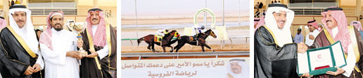 وفي نهاية الشوط الثالث سلم مدير عام فرع هيئة الهلال الأحمر السعودي بمنطقة القصيم الأستاذ صالح بن غدير التويجري الكأس لمالك الجواد الفائز محمد الموسى ثم قدم درع الهيئة لمدير عام النادي الأستاذ احمد التويجري تقديراً لما يقومون به تجاه رياضة الفروسية ثم سلم مدير عام النادي درعاً مماثلاً للهيئة تقديراً على الخدمات التي تقدمها للنادي باستمرار ولرعايتها الحفل وتشجيع ملاك الخيل.