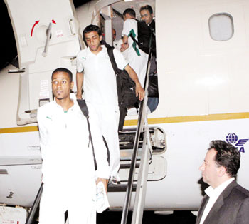 لاعب المنتخب السعودي نايف القاضي يحمل صحيفة الجزيرة أثناء نزوله إلى مطار طهران أمس الأول |