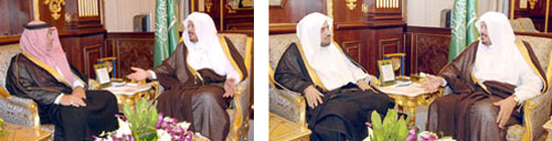 من جهة أخرى استقبل معالي رئيس مجلس الشورى الدكتور عبد الله بن محمد بن إبراهيم آل الشيخ بمكتبه في مقر المجلس بالرياض أمس كلاً من معالي وزير العدل الدكتور محمد بن عبدالكريم العيسى ومعالي وزير الحج الدكتور فؤاد بن عبدالسلام الفارسي في زيارة قدما خلالها التهنئة لمعالي رئيس المجلس بمناسبة الثقة الملكية بتعيينه رئيساً لمجلس الشورى في دورته الخامسة.