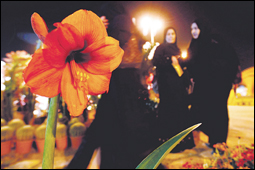 سعوديات في طريق الملك عبدالله بن عبد العزيز بالرياض أثناء تجولهن في معرض الزهور الذي يقام هذه الأيام على هامش مهرجان الربيع الثاني. |
