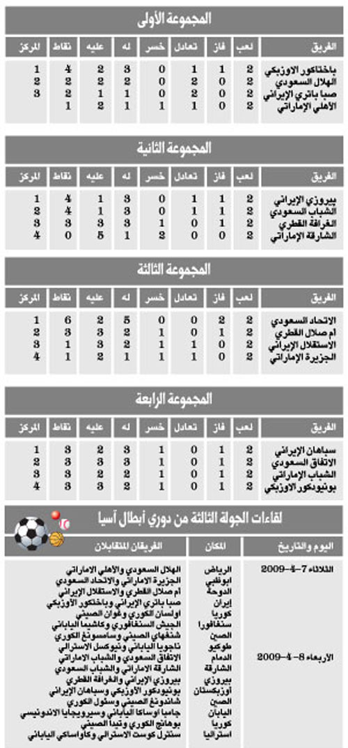 - غداً الأربعاء تتواصل الإثارة ويستمر التنافس وتكمل الفرق السعودية ركضها إذ يستضيف الاتفاق فريق الشباب الإماراتي في مواجهة يسعى فيها ممثلنا لخطف النقاط التي ستقربه كثيراً من التأهل عن المجموعة الرابعة، كونه يشارك في الصدارة بـ 3 نقاط مثله مثل باقي فرق المجموعة.. وفي المجموعة نفسها يلتقي بونيودكور الاوزبكي وسباهان الإيراني بطموح وآمال متشابهة.