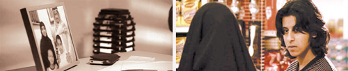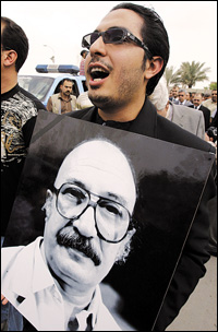 ابن المخرج المسرحي العراقي قاسم محمد يحمل صورة والده الذي توفي في مدينة الشارقة الإماراتية عن عمر ناهز الخامسة والسبعين إثر مرض عضال ألمَّ به منذ أكثر من عام، ودفن أمس في بغداد بعد نقله من دبي.