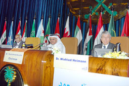 تواصلت أمس فعاليات البرنامج العلمي لمؤتمر تحلية المياه في البلدان العربية في يومه الثاني بعقد ثلاث جلسات الأولى كانت حول التحلية بالطرق الحرارية برئاسة نائب الرئيس التنفيذي للتخطيط والمشاريع بهيئة الكهرباء والماء بمملكة البحرين الدكتور خالد بوراشد، واشتملت على ثلاث أوراق عمل، أما الجلسة الثانية التي كانت بعنوان التحلية بالتناضح العكسي برئاسة مدير عام المؤسسة العامة لتحلية المياه بالساحل الغربي المهندس عبدالهادي الشيخ واشتملت على أربع أوراق عمل، أما الجلسة الثالثة والأخيرة فكانت بعنوان وحدات التحلية متعددة التأثير ام أي دي ترأسها الرئيس التنفيذي لهيئة الكهرباء بمملكة البحرين معالي الدكتور عبدالمجيد العوضي، حيث ناقش فيها كل من: نائب رئيس شركة سيدم الفرنسية المهندس جيرراد كانتون ونائب شؤون التحلية بشركة وباق الألمانية المهندس اوتو ميدك كذلك نائب رئيس شركة ساساكورا اليابانية ما توصلت إليه هذه الصناعة من تطورات وآخر المستجدات التقنية بالإضافة إلى المعوقات التي يعاني منها المصنعين بتطوير هذه الصناعة.
