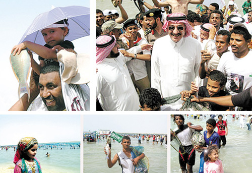 ملابسهم مبللة.. خرجوا من البحر يحملون خيراته (سمك الحريد).. وصاحب السمو الملكي الأمير محمد بن ناصر بن عبدالعزيز أمير منطقة جازان لم ينتظر حتى (تجف) ملابسهم، بل حرص أن يشاركهم ويزف الفرحة ويصافحهم (فرداً.. فرداً) وهجر كرسيه لينزل البحر وسط الصيادين وفرحة
