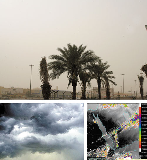 كما توقعت الأرصاد الجوية وحماية البيئة اليوم السبت أن يظل تأثير العوالق الترابية على شرق ووسط وجنوب المملكة هذه الليلة ونهار الغد حيث يقل مدى الرؤية الأفقية بشكل ملحوظ إلى أقل من 3 كم وتنشط الرياح السطحية نهار الغد على الأجزاء الداخلية من غرب المملكة مثيرةً للأتربة والغبار لتحد من مدى الرؤية الأفقية. وتظهر السحب الركامية في فترة ما بعد الظهيرة على مرتفعات عسير تمتد إلى منطقة نجران وتظهر السحب المتوسطة والعالية على جنوب شرق المملكة.