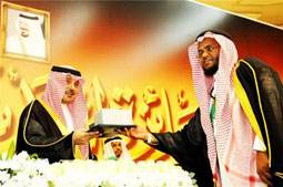 سلم صاحب السمو الملكي الأمير عبدالعزيز بن ماجد أمير منطقة المدينة المنورة ورئيس مجلس أمناء الجائزة الدكتور عبدالرحمن بن رجاء الله السلمي عضو هيئة التدريس بقسم اللغة العربية بكلية المعلمين، ومدير العلاقات العامة والإعلام التربوي بالكلية جائزة المدينة المنورة في فرع التفوق والإبداع العلمي وذلك عن رسالته للدكتوراه.