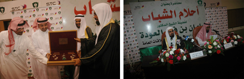 جذب فضيلة الشيخ الدكتور سلمان بن فهد العودة الحضور الجماهيري الكبير لمحاضرته التي ألقاها بصالة الأمير خالد بن عبدالله للألعاب المختلفة بالنادي الأهلي بعمق تناوله لواقع الشباب وقضاياهم وتطلعاتهم.. وكانت المحاضرة التي ألقاها فضيلته بعنوان (أحلام الشباب) وجاءت بداية المحاضرة بمقدمة بسيطة عن الضيف ألقاها الدكتور علي باناعمه.