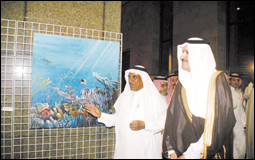 صاحب السمو الملكي الأمير فيصل بن سلمان بن عبدالعزيز رئيس اللجنة التنفيذية في الجمعية الخيرية لرعاية الأيتام (إنسان) خلال جولته في معرض (أطياف الود الثاني للفن التشكيلي) الذي افتتحه وتنظمه جمعية (إنسان) بالمتحف الوطني بمركز الملك عبدالعزيز التاريخي بالرياض. |