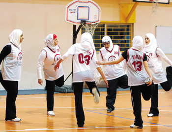 لاعبات سعوديات من فريق جدة لكرة السلة خلال استعداداتهن لمباراة مع نظيراتهن الأردنيات في العاصمة الأردنية عمان ليلة أمس الأول |
