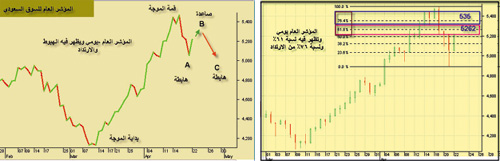 حينما بدأ المؤشر العام في موجته من 4068 تضخمت الكثير من المؤشرات اليومية كالماكد والار اس آي والاستوكاستك وغيرها من المؤشرات وكان من الطبيعي جدا أن تأتي موجة تصحيحية لتلك الموجة الطويلة والتي انتهت عند 5495 بطول 1426 نقطة فتراجع المؤشر في موجة هابطة A حتى 4893 وهو مستوى قريب من 50% من طول الموجة الصاعدة ثم ارتقى في الموجة الصاعدة B والتي لا يزال فيها وقد يكون انتهاؤها بين 5262 وبين 5352 ومنها يتراجع ثانية في الموجة C والتي يفترض موجيا أن تكسر مستوى 5000 ثانية إن كانت ZZ وربما أيضا قاع الأسبوع الماضي، إلا إن كانت الموجة التصحيحية نمط تصحيحي آخر لم يتضح بعد، وبهذا حسب النظرة الموجية فقد يكون للتراجع بقية وقد لا يكتفي المؤشر بما تراجعه من نقاط ويظل المسار الهابط الذي سلكه المؤشر من 5495 قائما حتى يتجاوزها ويتداول فوقها بنقاط كثيرة ولعدة أيام