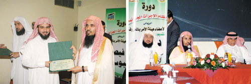 وكان الدكتور عبدالله الشثري قد شهد ظهر أمس الأربعاء ختام الدورة التدريبية الرابعة التي نظمها فرع الرئاسة العامة لهيئة الأمر بالمعروف والنهي عن المنكر بالرياض بعنوان (دورة الإجراءات الجزائية) بمشاركة (27) عضواً من أعضاء هيئة الأمر بالمعروف والنهي عن المنكر حيث اشتملت الدورة والتي استمرت فعالياتها خمسة أيام على عدد من الموضوعات المتنوعة من أبرزها إجراءات الضبط الإداري والتفتيش.