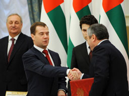 من جهة أخرى وقّعت روسيا أمس الخميس اتفاقا مع جمهوريتي أبخازيا وأوسيتيا الجنوبية الانفصاليتين عن جورجيا تتولى بموجبه موسكو مهمة حراسة حدود هاتين الجمهوريتين لمدة خمسة أعوام. وجاء في نص الاتفاق الذي وقعه الرئيس الروسي ديمتري مدفيديف في الكرملين (خدمة لأمنها وأمن الاتحاد الروسي وبانتظار تشكيل قوات حرس الحدود الخاصة بها، ستعهد أوسيتيا الجنوبية إلى روسيا مهمة حماية حدودها). كذلك وقّعت أبخازيا اتفاقا مطابقا مع روسيا، وكلا الاتفاقين يسري لمدة خمس سنوات.