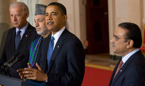 وقال اوباما في حضور الرئيسين في البيت الأبيض (أنا سعيد بأن هذين الرجلين، الزعيمين المنتخبين لأفغانستان وباكستان، يقدران تماماً خطورة التهديد الذي يواجهنا، وجددا تأكيد التزامهما بمواجهة هذا التهديد).
