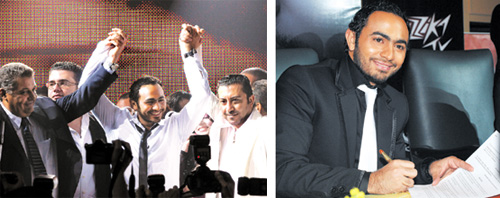 أقامت شركة مزيكا مساء الأحد الماضي حفلاً بمناسبة توقيعها عقداً مع الفنان المصري تامر حسني.. ويبدو في الصورة الأولى يوقّع عقده وفي الصورة الثانية الفنان مع المنتجين محسن جابر وسامح محروس. |