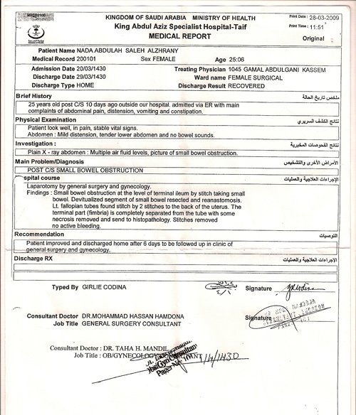عقب ذلك طالب الزوج بخروج زوجته من المُستشفى بعد أن كان قد دفع فاتورة قدرها 11.500 ريال وما كان من الأطباء إلا أن عرضوا عليه إبقاءها لديهم وعلى حساب المستشفى من أجل أن تتحسن حالتها الصحية إلا أنه أصر على خروجها لحين أن أكدت طبيبة الولادة أن ذلك خطر عليها وعلى حالتها الصحية وذكرت له أنها خاطبت مدير المُستشفى وأنه تكفل بإبقائها على حسابه الخاص مما زاد من شكوكه وعلى الرغم من ذلك بقيت لديهم يومين أخريين وزادت حالها سوءاً مما زاده إصرارا على إخراجها من هذا المستشفى حيث لم يُمانعوا بشرط أن يُخرجها على مسؤوليته الخاصة وأن يُخلي مسؤوليتهم حيث رفض وطالب بخروجها عن طريق إسعاف المُستشفى الخاص لحين أن نسق المُستشفى الخاص مع مستشفى الملك عبدالعزيز التخصصي من أجل نقلها إليهم وتم ذلك بُمرافقة طبيبة معها في سيارة الإسعاف مُشيراً على أنهُم وقبل صعودهم للإسعاف حضر أحد الأطباء وأبلغ الزوج بألا يتفاجأ بأن زوجته تعرضت لانسداد معوي ويتطلب عملية جراحية وهذا يؤكد علمهم المُسبق بذلك لحين أن تم نقلها للمُستشفى مُرفقةً بالتقارير الطبية للحالة وذكر أنه تم تنويمها بالمُستشفى التخصصي وأجريت لها الفحوصات لحين أن تم إجراء عملية استكشاف للحالة بعد الشك في وجود انسداد معوي وبعد العملية تم الكشف عن أن المُستشفى الخاص قام بإجراء خياطة مجرى المبيض وجزء من الأمعاء أثناء خياطة العملية القيصرية وأن هذا خطأ طبي منهُم لم يخبروه عنه لحين أن قام طبيب التخصصي بتصحيح الخطأ الطبي واستئصال جزء من الأمعاء وتنظيف مجرى المبيض إلا أن ذلك أبقاها في حالٍ صحي متدهورة حتى الآن.